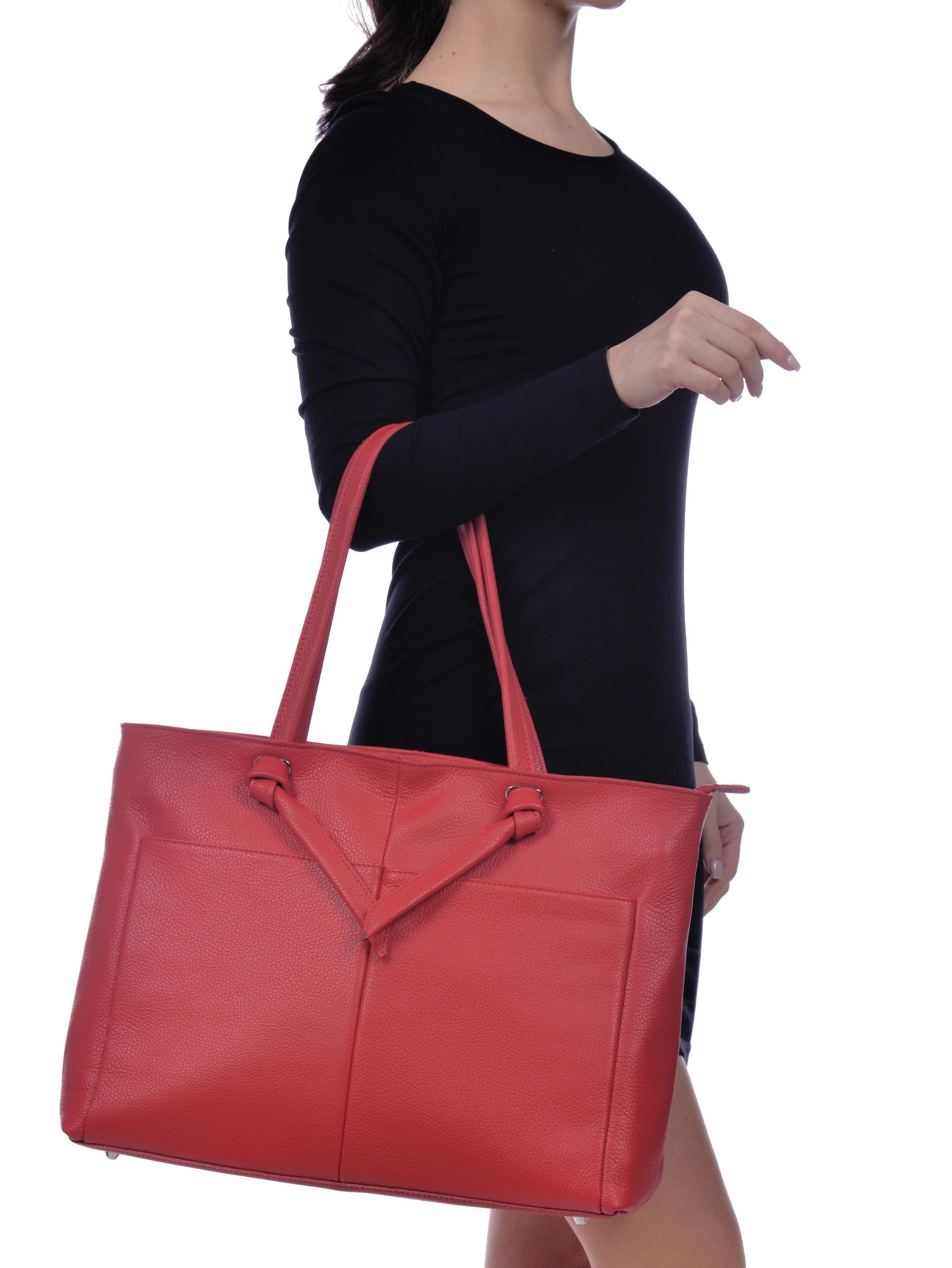 La borsa a mano Anna Luchini è realizzata interamente in vera pelle di vacchetta e coniuga eleganza e funzionalità moderna. Il modello presenta una chiusura superiore con cerniera ed è decorato con tasche frontali che aggiungono stile e praticità. L'interno è ben organizzato, con uno scomparto con cerniera e un'ulteriore tasca interna, ideale per riporre piccoli oggetti. Con dimensioni di 30 x 43 x 11 cm, la borsa offre ampio spazio per le attività quotidiane. I manici da 54 cm consentono un comodo trasporto a mano o al braccio, e questo modello non include la tracolla.
